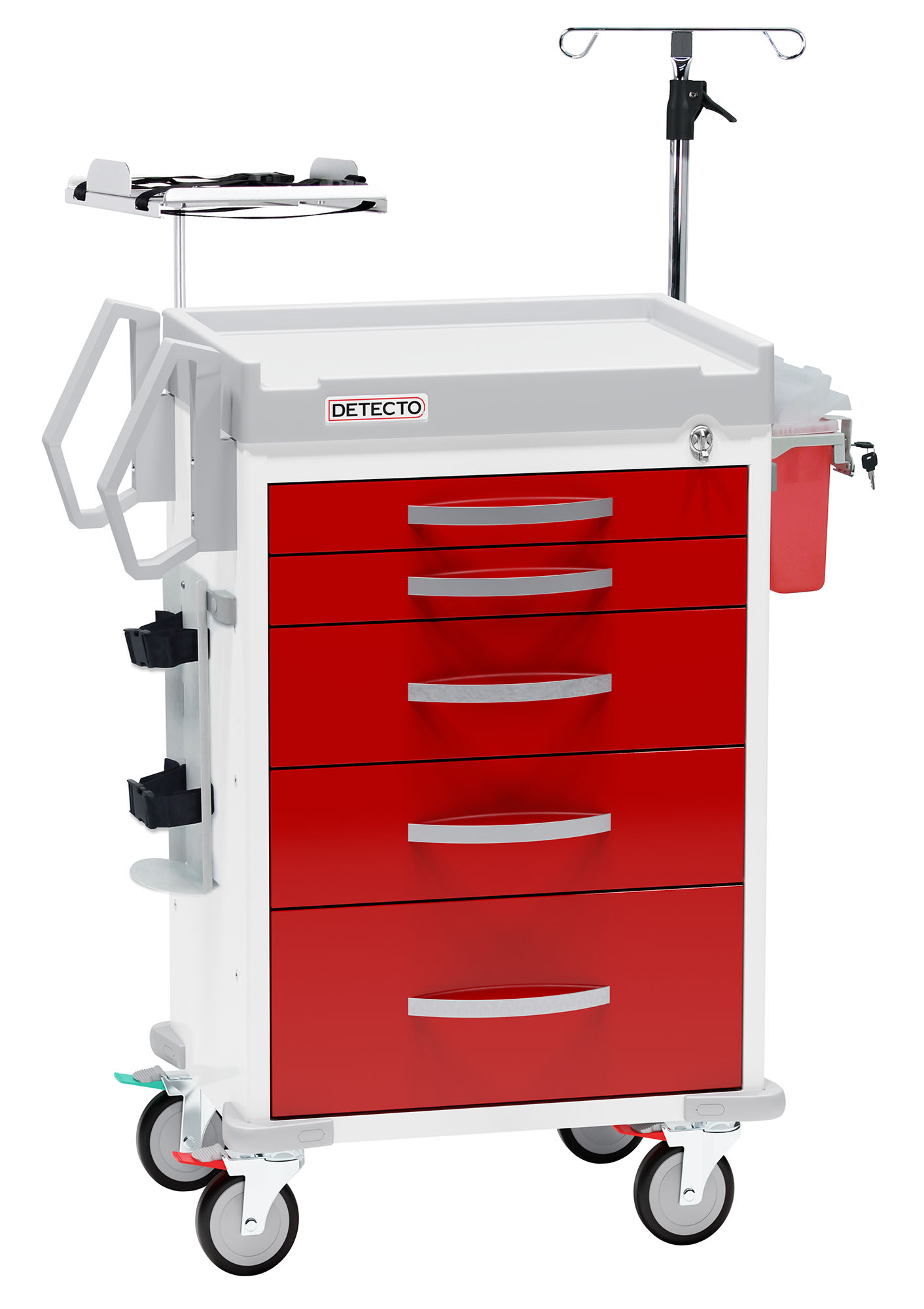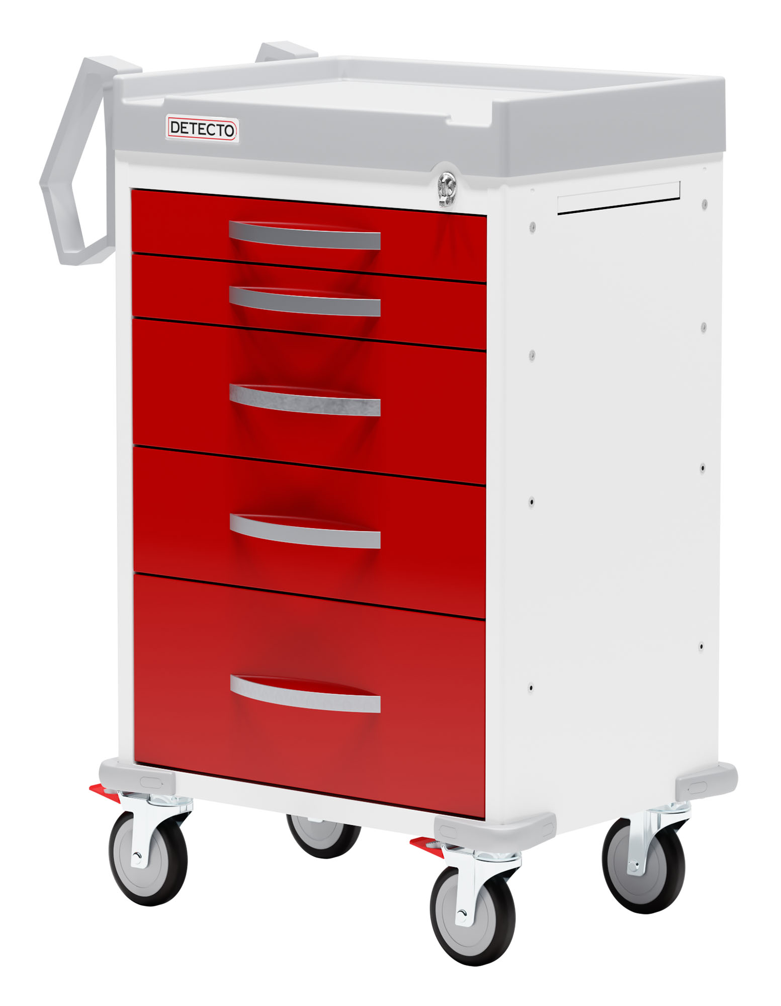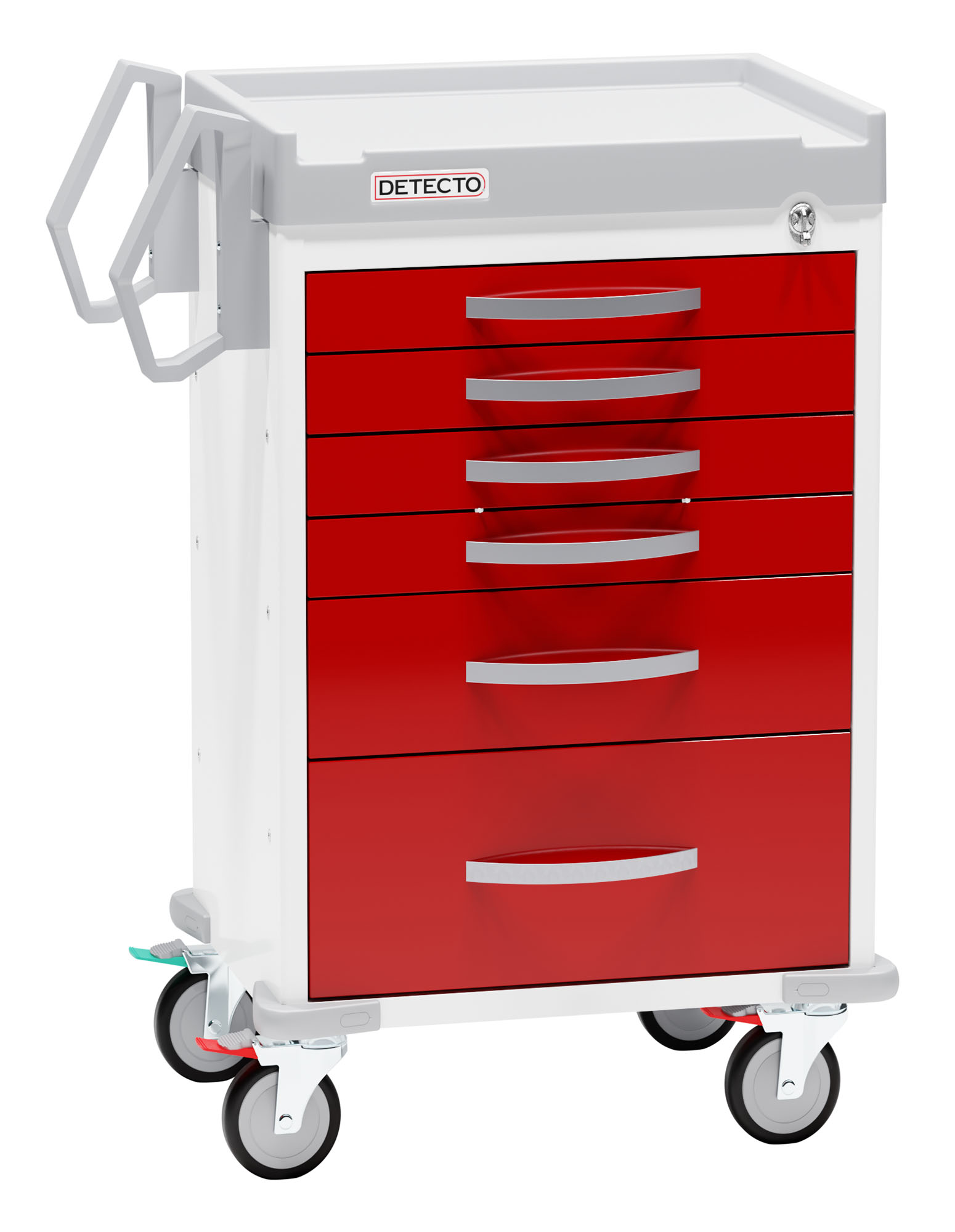 The Rescue series medical carts combine durability, mobility, and ergonomic design for fast-paced healthcare environments. Available in red, blue, yellow, or white, the carts feature five or six drawers and 360° maneuverability for navigating tight spaces. Built with a powder-coated steel body and easy-to-clean ABS countertop, the carts now include new ergonomic push handles for improved comfort and control, plus an easy push-to-release countertop extension for added workspace. A keyed or EMG breakaway central lock secures all drawers simultaneously, while 5-inch wheels with parking and steering locks and ABS corner bumpers ensure stability and protection. Optional accessories let you customize or choose a fully stocked, ready-to-use configuration.